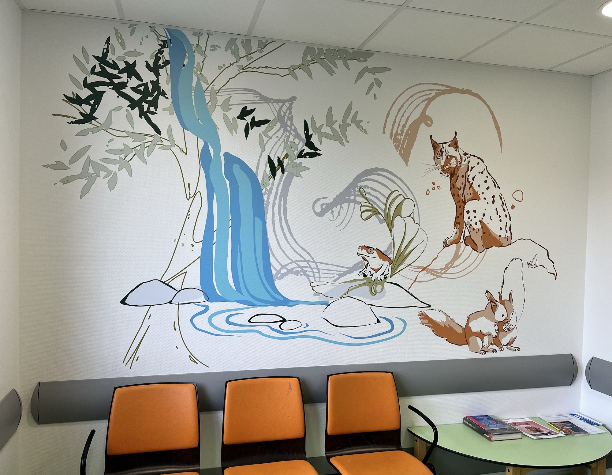 Chez Univers & Déco, c’est la nature qui nous inspire en permanence. Pour ce service du Centre Hospitalier de Beaune, en fonction des couleurs des salles et des publics attendus, nous avons décidé de nous appuyer sur des thèmes, avec des animaux associés : le monde sous-marin et sa baleine majestueuse, le sol de la forêt avec le mystérieux lynx de nos régions, et sur les hauteurs, des hiboux qui veillent, etc. Dans chaque espace, le maître-mot est la bienveillance. Les couleurs sont lumineuses mais douces à la fois, et se fondent avec le décor et le mobilier déjà présent, mais leur légèreté leur permettra de s’adapter à d’éventuelles nouvelles configurations.