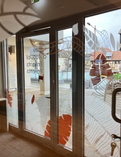 Les Univers de Stéphanie a réalisé plusieurs décors muraux, vitrophanie et signalétique, sur le thème des animaux d’Afrique, avec de belles grandes feuilles exotiques pour lier tous les espaces du LAEP de l’Apedi Alsace. Les différentes scènes et les couleurs ont été travaillées conjointement avec le cabinet Bik Architecture pour se marier parfaitement avec les revêtements, les mobiliers, et même les textiles de décoration.